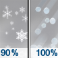 Temperature: 30°F Wind Speed: 6 to 17 mph Wind Direction: NE Forecast: Snow before 4pm, then snow and a chance of sleet. Cloudy. High near 30, with temperatures falling to around 26 in the afternoon. Wind chill values as low as 6. Northeast wind 6 to 17 mph, with gusts as high as 33 mph. Chance of precipitation is 100%. New snow accumulation of 8 to 12 inches possible. |