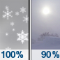 Temperature: 12°F Wind Speed: 2 to 8 mph Wind Direction: E Forecast: Snow. Cloudy, with a low around 12. Wind chill values as low as 0. East wind 2 to 8 mph. Chance of precipitation is 100%. New snow accumulation of 10 to 14 inches possible. |