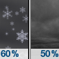 Temperature: 35°F Wind Speed: 15 mph Wind Direction: N Forecast: Rain and snow likely before 9pm. Cloudy, with a low around 35. North wind around 15 mph. Chance of precipitation is 60%. |