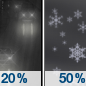 Temperature: 34°F Wind Speed: 5 mph Wind Direction: W Forecast: A chance of snow before 5pm. Mostly cloudy, with a high near 34. |
