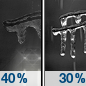 Temperature: 33°F Wind Speed: 2 to 6 mph Wind Direction: NE Forecast: A chance of rain. Mostly cloudy, with a low around 33. Chance of precipitation is 40%. |