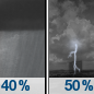 Temperature: 60°F Wind Speed: 6 to 9 mph Wind Direction: NW Forecast: A chance of showers and thunderstorms before 7pm. Mostly clear, with a low around 60. Chance of precipitation is 30%. |