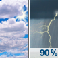 Temperature: 52°F Wind Speed: 6 to 10 mph Wind Direction: SE Forecast: Showers and thunderstorms before 7pm, then rain likely between 7pm and 10pm, then showers and thunderstorms likely between 10pm and 1am, then rain. Mostly cloudy, with a low around 52. Southeast wind 6 to 10 mph, with gusts as high as 21 mph. Chance of precipitation is 90%. New rainfall amounts between a quarter and half of an inch possible. |