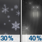 Temperature: 35°F Wind Speed: 10 to 15 mph Wind Direction: N Forecast: Isolated snow showers after 3am. Mostly cloudy, with a low around 35. North wind 10 to 15 mph. Chance of precipitation is 20%. |