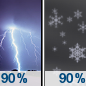 Temperature: 33°F Wind Speed: 2 to 13 mph Wind Direction: SSW Forecast: Showers and thunderstorms before 2am, then rain between 2am and 5am, then rain and snow. Cloudy, with a low around 33. South southwest wind 2 to 13 mph. Chance of precipitation is 90%. |