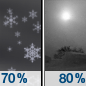 Temperature: 32°F Wind Speed: 3 to 7 mph Wind Direction: SW Forecast: A chance of snow showers. Mostly cloudy, with a high near 32. Chance of precipitation is 40%. |