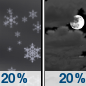 Temperature: 18°F Wind Speed: 7 mph Wind Direction: W Forecast: A chance of snow. Partly cloudy, with a low around 18. West wind around 7 mph. Chance of precipitation is 30%. |