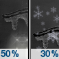 Temperature: 30°F Wind Speed: 3 mph Wind Direction: SW Forecast: Snow likely. Cloudy, with a high near 30. Southwest wind around 3 mph. Chance of precipitation is 60%. New snow accumulation of less than half an inch possible. |