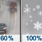 Temperature: 30°F Wind Speed: 10 to 16 mph Wind Direction: S Forecast: Snow likely after 7am. Mostly cloudy, with a high near 30. Chance of precipitation is 60%. New snow accumulation of less than one inch possible. |