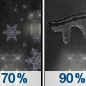 Temperature: 19°F Wind Speed: 5 to 10 mph Wind Direction: NE Forecast: Sleet likely and rain showers likely before 10pm, then sleet likely and rain showers likely and patchy fog between 10pm and midnight, then sleet and freezing rain and rain showers and patchy fog. Cloudy, with a low around 19. Chance of precipitation is 90%. New snow accumulation of less than half an inch possible. Little or no ice accumulation expected. |