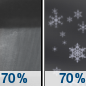 Temperature: 30°F Wind Speed: 0 mph Wind Direction: Forecast: Rain showers likely before 4am, then a chance of snow showers. Cloudy, with a low around 30. Southwest wind around 0 mph. Chance of precipitation is 70%. New snow accumulation of less than half an inch possible. |