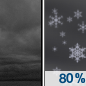 Temperature: 26°F Wind Speed: 10 to 15 mph Wind Direction: NW Forecast: Snow likely. Mostly cloudy, with a high near 26. Chance of precipitation is 70%. New snow accumulation of around one inch possible. Little or no ice accumulation expected. |