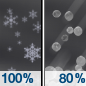 Temperature: 14°F Wind Speed: 3 to 7 mph Wind Direction: NE Forecast: Snow before 1am, then snow and a chance of sleet. Cloudy, with a low around 14. Northeast wind 3 to 7 mph. Chance of precipitation is 100%. New snow accumulation of 4 to 8 inches possible. |