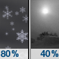 Temperature: 17°F Wind Speed: 6 to 13 mph Wind Direction: W Forecast: A chance of snow. Mostly cloudy, with a high near 17. Chance of precipitation is 40%. |