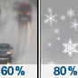Temperature: 24°F Wind Speed: 6 mph Wind Direction: NE Forecast: Rain and snow before 7pm, then rain and snow likely. Cloudy, with a low around 24. Wind chill values as low as 19. Northeast wind around 6 mph. Chance of precipitation is 80%. New snow accumulation of less than half an inch possible. |