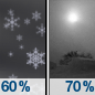 Temperature: 29°F Wind Speed: 0 to 6 mph Wind Direction: S Forecast: A chance of snow after 11am. Mostly cloudy, with a high near 29. South wind 0 to 6 mph. Chance of precipitation is 50%. New snow accumulation of less than half an inch possible. |