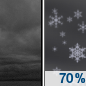 Temperature: 13°F Wind Speed: 5 mph Wind Direction: N Forecast: Snow likely after 1am. Cloudy, with a low around 13. North wind around 5 mph. Chance of precipitation is 70%. New snow accumulation of 1 to 2 inches possible. |