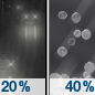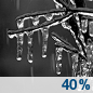 Temperature: 20°F Wind Speed: 5 mph Wind Direction: N Forecast: A chance of freezing rain. Mostly cloudy, with a low around 20. Chance of precipitation is 40%. New snow accumulation of less than half an inch possible. New ice accumulation of less than half an inch possible. |