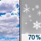 Temperature: 32°F Wind Speed: 6 mph Wind Direction: NE Forecast: Snow likely after 1pm. Mostly cloudy. High near 32, with temperatures falling to around 30 in the afternoon. Wind chill values as low as 13. Northeast wind around 6 mph. Chance of precipitation is 70%. New snow accumulation of 1 to 2 inches possible. |