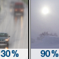 Temperature: 36°F Wind Speed: 6 to 12 mph Wind Direction: N Forecast: A chance of rain between 10am and noon, then rain and snow between noon and 5pm, then snow and areas of blowing snow. Cloudy. High near 36, with temperatures falling to around 28 in the afternoon. North wind 6 to 12 mph, with gusts as high as 23 mph. Chance of precipitation is 90%. New snow accumulation of 1 to 2 inches possible. |